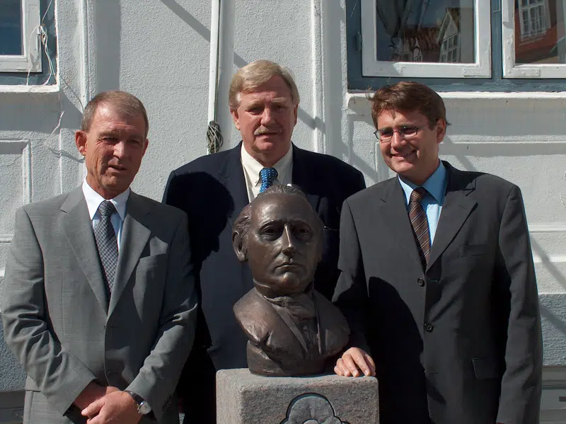Her ses Borgmester Knud Gether, Forretningsmand Jens Olesen og Kulturminister Brian Mikkelsen, som indviede Mads Lange-busten på Rudkøbings torv. © Aug. 2007